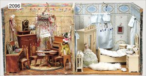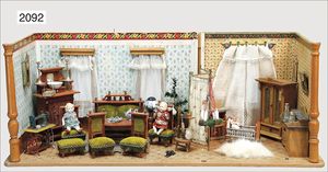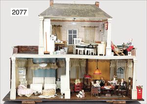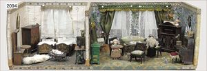 kl. 2-teilige Puppenstube mit lithogr. Papier beklebt, 3 Fenster ohne Fensterglas, auflithogr. Dekorationsstücke, seltene Sitzgruppe aus Nadelholzzweigen, Zinnleuchter, Schlafzimmermöbel, 2 Puppen, Zubehör, 56 cm breit, 26 cm hoch