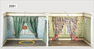 2-teiliges Puppenstuben-Gehäuse, 96 cm breit, 38 cm hoch, 40 cm tief, 4 Fenster, 2 Fenstergläser gebrochen, Durchgangstür, alte Tapete, teilw. Wasserflecken