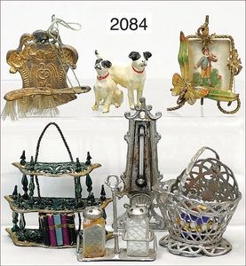 Konv., Puppenstuben- Ausschmückungsteile, Salz und Pfeffer, Zinn, 2 kl. Hunde, Guss, Wandregal mit Büchern, Thermometer, Schale, Tischbild Messingblech vergoldet, Kehrschaufel mit Besen, Zinn