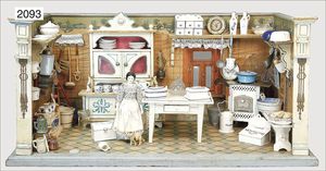 Puppenstubenküche, 75 cm breit, 41 cm hoch, 40 tief, reichhaltig Zubehör, Porzellan-, Blech- und Messingteile, mit Herd, alte Tapete, teilweise farblich ausgebessert