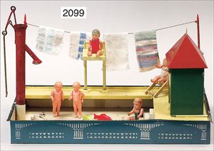 wohl KIBRI Schwimmbad, 42 cm lang, 27,5 cm tief, Umkleide, Turm, Pumpe, dazu einige Celluloidpuppen, bespielt, gut, ca. 1920
