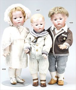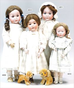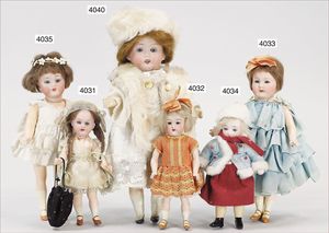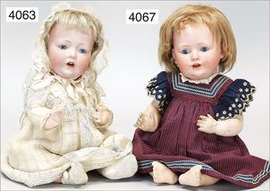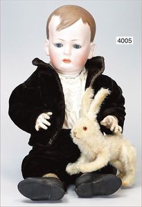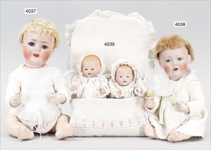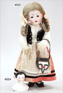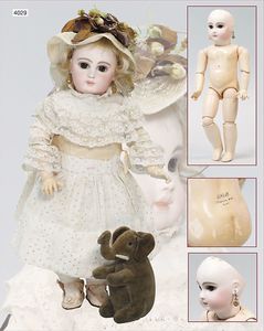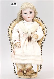 Biskuitporzellankopf-Puppe, gemarkt 6969 Germany 5, blaue gemalte Augen, geschl. Mund, Kopfdeckel nicht zu entfernen, von außen keine Risse erkennbar, Mohairperücke, Gliederkörper, 41 cm, guter Zust.