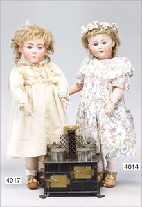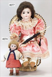 frühe JUMEAU gemarkt EJ 8, um 1880, gepresster Biskuitkopf, braune fest eingesetzte Glasaugen, (Paperweight), geschl. Mund, aufgesetzte, durchstochene Ohren, 1 Ohrring fehlt, Orig.-Korken, Orig.-Schafsfell-Perücke, ziemlich ausgegangen, zusätzlich alte Mohairperücke, Orig. früher Kugelgelenkkörper von JUMEAU, Abplatzern an der Seite, Orig.-Federaufzug, am Rücken gemarkt mit blauem Stempel: Paris Medaille d´Or, Körper in gutem Zust., feste Handgelenke, Puppe mit sehr schönem Ausdruck, im Orig.-Kart., teilw. etwas verschlissen, innen im Mundwinkel punktueller Brandriss, nicht durchgehend und von außen nicht sichtbar, alte JUMEAU-Schuhe