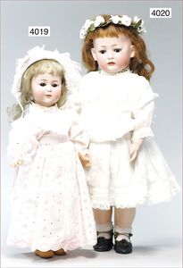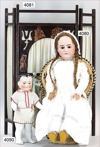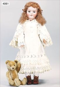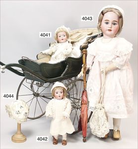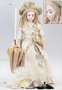 SIMON & HALBIG Biskuitporzellan-Kurbelkopf-Puppe, um 1890, gemarkt 1070/18, braune fest eingesetzte Glasaugen, off. Mund, oben Zahnreihe, durchst. Ohren, Kinngrübchen, Klebereste an der Kopfkorne, Ausbruch an der Halskurbel mit ausgehendem Riss, Kopf liegt lose bei, Masse-Gliederkörper, 1,10 m, Gliederkörper übermalt, altes Kinder-Taufkleid, alte Unterwäsche, Echthaarperücke, dazu alte Spitzenhaube und 1 Flanierschirm