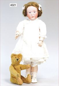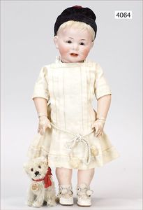 KESTNER Biskuitporzellankopf-Puppe, Hilda, gemarkt 245 DJK 1914, C im Kreis, braune Schlafaugen, off. Mund, Zähne oben, Zunge, Gipsdeckel nicht zu entfernen, Transportrisiko für Augenmechanismus beachten, Sitzbabykörper mit abstehendem Zeh, untersch. Handhaltung, übermalt, 46 cm, guter Zust., Mohairperücke
