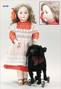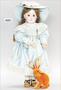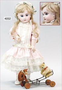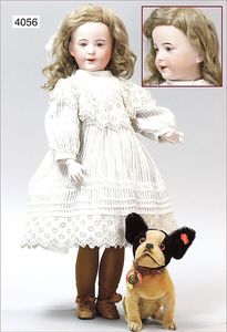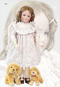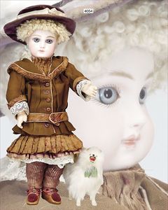 JUMEAU gemarkt 4, um 1880, blaue fest eingesetzte Paperweightaugen, geschl. Mund, durchst. Ohren, sehr helles Porzellan, Biskuit-Kurbelkopf-Puppe, 1 Ohrring fehlt, franz. Gliederkörper, feste Handgelenke, 38 cm, alte Kleidung, ein wenig verschlissen, alte Schuhe, dazu Schafswollperückefest aufgeklebt u. stark ausgegangen , alter passender Hut, minimale Ofenstaubeinschlüsse, kl. Hund, 12 cm, weiß