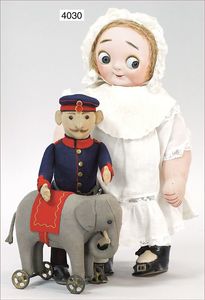 Googly, Masse-Gesicht, teilw. farbl. ausgebessert, gr. Glasaugen, seitl. blickend, Melonenmund, Filzkörper, bewegl. Arme und Beine, Stimme intakt, alte Schuhe, alte Kleidung, Mohairperücke fest aufgeklebt