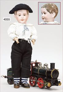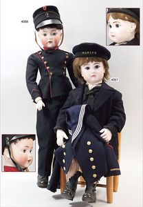 STEINER Biskuitporzellan-Kurbelkopf-Puppe, franz. Gliederkörper, gemarkt J. Steiner, BTÈ S. G. D. G. Paris S/RE/A2, blaue fest eingesetzte Paperweightaugen, geschl. Mund, unten Grübchen, durchst. Ohren, extrem detaillierte ausmodellierte Biskuit-Hände, alte Matrosenkleidung, Kinder-Lederstiefel, zusätzl. Matrosenjacke und Matrosenmütze, mit Aufschrift Marine, 85 cm, ausgef., ca. 1880