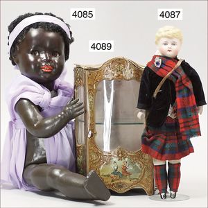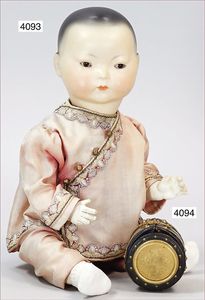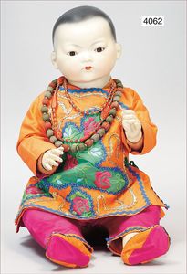 AM Biskuitporzellankopf-Puppe, Orientale, um 1926, gemarkt M Germany, 353/8.H, Vollkopf, Riss am Hinterkopf, braune fest eingesetzte Glasaugen, geschl. Mund, getönter Haarboden, Babykörper, 60 cm, seltene Gr., asiatische Kleidung neuer, feste Handgelenke