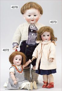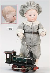 GEBR. HEUBACH Biskuitporzellan-Kurbelkopf-Puppe, um 1912, gemarkt 13/7246 HEUBACH im Quadrat Germany, um 1892/93, blaue fest eingesetzte Glasaugen, geschl. Mund, rot/blonde Echthaarperücke, Gliederkörper in gutem Zust., alte Kleidung alte Lederschuhe, ein wenig verschlissen, 78 cm, außergew. Gr., in dieser Gr. Äußerst selten