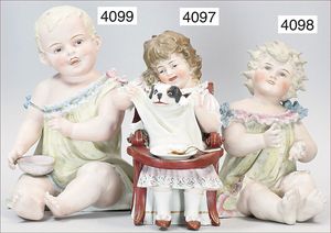 Pianobaby, Junge mit Teller, anmodellierte Kleidung, off. Mund, mit Zahnreihe, stark ausmodellierte Haare, Ausdrucksstark