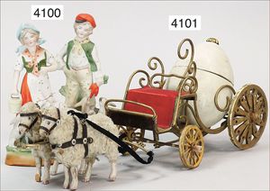 Kutsche, Messingdraht, Holz-Speichenräder, (Vorderräder orig?), 2 Wollschafe (Wolle abgerieben), Masse-Ei, Candy Container, 42 cm