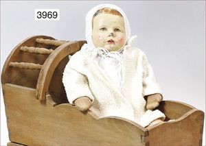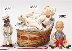 Zugspiel, Papiermaché, Baby im Korb, altersbedingt stellenweise Farbabrieb an Oberlippe und Nase, Länge ca. 19 cm