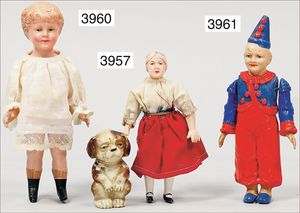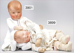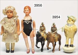 2 Teile Celluloid, JUNO, Dame, 20er Jahre, 9 cm, modellierte Haare, Druckstelle am Hinterkopf, bewegl. Arme und Beine, sowie kl. Steifbein-Puppe, 8,5 cm