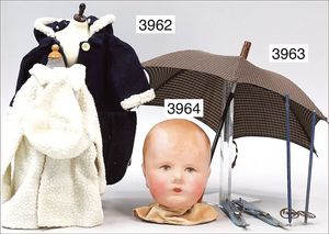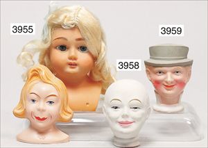 SCHILDKRÖT SoR, Celluloid-Brustblatt-Kopf, Größe 8, insg. 8 cm hoch, blaue Schlafaugen, off. Mund, oben Zähne, dazu 1 Maskenkopf, Moritz, SoR, guter Zust.
