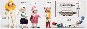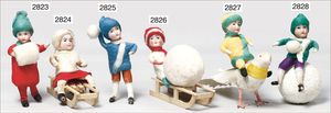 HEUBACH Weihnachtsschmuck, Kind auf Schlitten, Biskuit-Kopf, Wattekreppkleid, 6,5 cm, sehr guter Zust.
