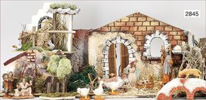 Weihnachtsgrippe, Grundplatte ca. 50 cm x 40 cm, teilweise aus Kork gearbeitet, bemalt, mit reichhaltig Zubehör, Hühnerstall, Masse-Figuren