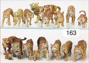 ELASTOLIN; LINEOL 6 Tiger, Masse, 7-teilige Löwengruppe, meist Zust. 2