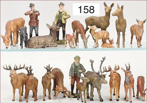 halbplastisches Bild, Bergszene, mit Hirschgruppe, dazu 4 Masse-Hirsche, 1 Jäger, ELASTOLIN, 11 cm, Zust. 2-3