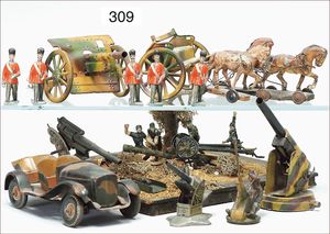 HAUSSER 3-achsiger LKW, mit Geschütz, Blech, 25 cm, 1 Lampe liegt lose bei, leicht bespielt, gut