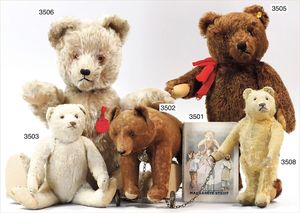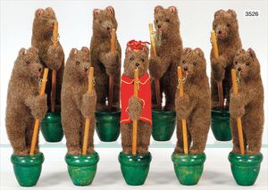 STEIFF seltenes Bären-Kegelspiel, ca. 1893, 9 Bären, Stehhöhe ohne Kegel 19 cm, mit Kegel 23 cm, Schuhknopfaugen, dunkelbraunes Kurzmohair, rote Filzzunge, Ohrmuschel aus rosafarbenem Filz, an Orig.-Kette und Stock befestigt, unbespielter Zust., dazu ein ,,König", Bär mit rotem Filzmantel und roter Filzkrone, extrem seltenes Teil der Steiff-Produktion