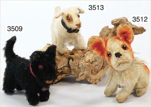 STEIFF Hund, Foxterrier, ca. 1901-1909, Samt, sitzend, 12 cm, beige/braun, ein Fleck nachträglich eingesetzt, mit Maulkorb, Schuhknopfaugen