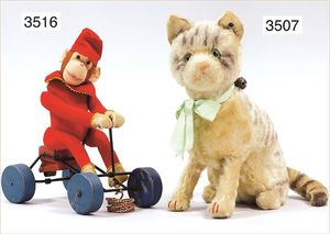 STEIFF Record-Peter, ca. 1920, mit Knopf, 20 cm, Filz-Affe mit Filz-Kleidung im guten Zust., auf Selbstfahrer, Bewegung und Stimme nicht intakt, schöne kräftige Farben