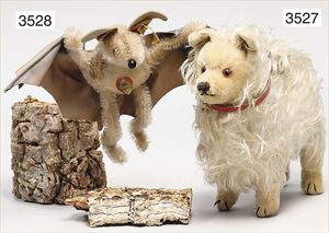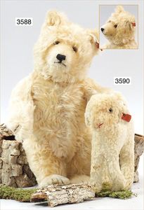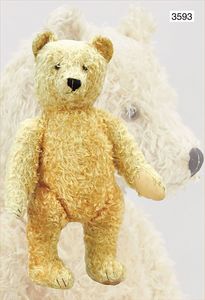 STEIFF Bär, ca. 1930, 29 cm, lange abgeknickte Arme, leichter Buckel, mit Knopf, kl. Fehler an den Filztatzen, weiß, Mohair etwas abgegriffen, Stimme defekt