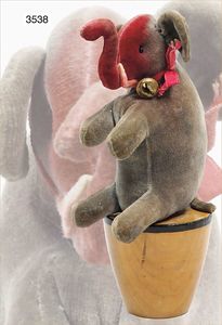 STEIFF Kegel-Elefant, ca. 1900, Samt , 18 cm, mit Orig.-Schleife und -Glocke, rote Verfärbung am Rüssel und Vorderkopf, Holzkegel, selten, guter Zust.