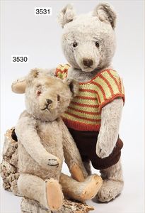 STEIFF Orig.-Teddy, mit Knopf, Strick-Hemd und -Hose, graues Mohair, Filztatzen am rechten Fuß etwas verschmutzt, schöner Ausdruck