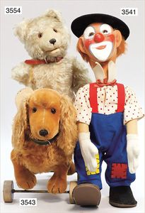 STEIFF Clownie, ca. 50er Jahre, 40 cm, Verformungen am Vinyl, eingesetzte Glasaugen, Filz an Händen und Füssen gut, ausgefallene Größe