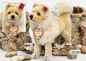 STEIFF Chow-Chow Brownie, ca. 1930, Zeppelin Mascot, mit Knopf, Schild und Fahne, Nr. auf der roten Fahne 1317,0, langhaariger Mohair, stehend, blaue Seidenschleife, schöne kräftigen Farben