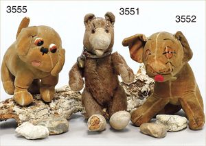STEIFF Bulldoge, sitzend, mit Knopf, ca. 1952, mit Filzdecke, Yale, mit Schelmenaugen, drehbarer Kopf, Sitzhöhe 27 cm, selten