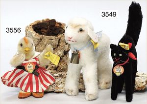 STEIFF 2 Teile, 1 x schwarzer Kater, Samt, mit Knopf, Schild und Fahne, Nr. 7410, 1 x Lamby, Knopf, Schild und Fahne, Höhe 14 cm
