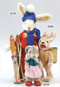 STEIFF Rico Skihase, mit Knopf, Schild und Fahne, Nr. 7828/43, ca. 1970, mit Heinzi Holzski, 40 cm, unbespielter Zust.