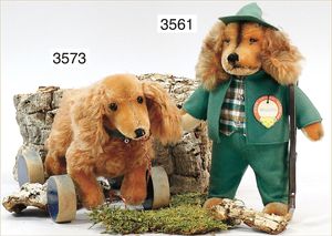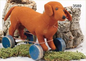 STEIFF Hoppel-Dackel, auf Holzrädern, mit Knopf und Fahne, Nr. 1117ex, ca. 1915, Filz, Lederhalsband, Zugstimme defekt, 17 cm
