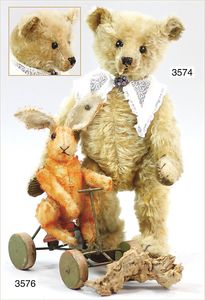 STEIFF Rekord-Hase, mit Knopf, ca. 1927, geflammtes orangenes Mohair, teilw. Etwas ausgegangen, gr. Glasaugen, Höhe auf dem 4-Rad 30 cm, bespielt, ausgef.