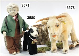 STEIFF Longhorn, Texas, ca. 1960, mit Knopf und Fahne, für Fao Schwarz USA, ca. 20 cm Stehhöhe, sehr selten