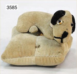 CHUCK VALLEY Bonzo, Samthund, Sitzhöhe 12 cm, mit Filzzunge, Halsband und Chuck Valley Knopf, leicht verschmutzter Orig.-Zust., Zunge orig.?