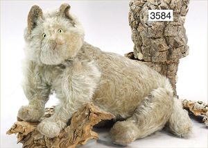 STEIFF Katze, Kitty, mit Knopf, ca. 1931-1934, grau gestromelt, sitzend, mit Halsdrehmechanik, minimal bespielt