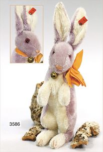 STEIFF Hase, ca.1930, mit Knopf und rote Fahne, Nr. 4329, 27 cm, stehend, lila Mohair, schöne kräftige Farbe, drehbarer Kopf, unbespielt