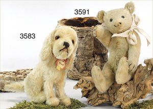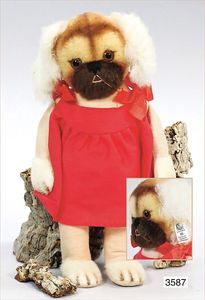 STEIFF ausgefallener Pupphund, ca. 1933, mit Knopf und weißer Fahne, Nr. 28, Fahne unbespielter Zustand, Plüschkopf, weicher Körper, gut stehende Beine, Schlenkerarme, lachsrotes Hängekleid, 27 cm, drehbarer Kopf, selten und im absoluten Orig., Zust