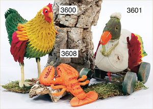 STEIFF Konv. 3 Teile, 1 x Zwerg Gucki, mit Knopf, Schild und Fahne, Nr. 713,1, 12 cm, 2 x Wollvögel mit Drahtbeinen, Küken Nr. 1506 und Hahn Nr. 1508