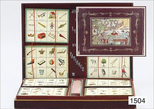 LOTO ENFANTIN JEU AMUSANT, Spiel, um 1900, Orig.-Kart. mit bunt lithogr. Deckblatt, ohne Anleitung, wohl weitgehend kompl.