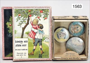 BIEDERMEIER Zauberkasten, Frankreich, Magnetspiel mit Sprüchen, aufwendig gestalteter Orig.-Kart., mit kl. bunt lithogr. Schachteln (Spielszenen), darin Sprüche, kreisender Rabe unter Glasplatte, durch Magnetscheibe angetrieben, Orig.-Kart., handkoloriert, museal, nahezu unberührter Orig.-Zust., ausgef.