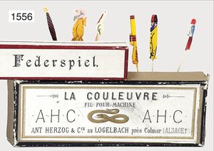 2 Teile, 1 x Federspiel, deutsch, im Orig.-Kart., 12 cm, aus Bein, handbemalt, teilw. Karikaturfiguren, 1 x Federspiel, "La couleuvre", Beinstäbe handbemalt, teilw. ein wenig zerbrochen, Orig.-Kart., 16 cm