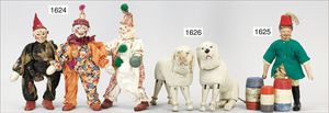 SCHOENHUT Humpty Dumpty, große Serie, Konv. 3 Teile, 1 x Clown, Holz gegliedert, 27 cm, anmodellierte Lederohren, Holzhut, 1 x Clown, 23 cm, Stoffkleidung, anmodellierte Lederohren, Stoffhut, 1 Fuss abgebrochen, dazu 1 Elefant, 14 cm, Lederohren, Glasaugen, Gummi-Stoßzähne, altersbed. Farbverlust