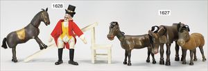 SCHOENHUT Humpty Dumpty, große Serie, 2 Esel, Holz gegliedert, 17 cm stehend, Lederohren bespielt, farbl. ein wenig ausgebessert, dazu Dompteur, Porzellankopf, 21 cm, Stoffkleidung, 1 x Akrobatin, Porzellankopf, 20 cm, mit Filzanzug, 1 Reifen, schönes Konv.
