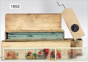 Bilder zu Laterna Magica, Orig.-Kart. gefüllt mit großformatigen ausgef. Glasbildern, 24 cm x 6,2 cm, 24 cm x 8,5 cm, 3 bewegliche Bilder, Leuchter mit Farbenrad, 18 cm x 11 cm, mit Kurbelantrieb, ausgef.