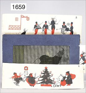 Schattentheater, "tiny tot´s electric shadow theatre", England, mit lithogr. Papier beklebt, 28,5 cm x 28 cm, minim. Einrissstelle am Pergamentpapier, bewegte Scherenschnittmotive, Kerzenfeuerung, bis auf kl. Knickstellen schöner, leicht bespielter Orig.-Zust., ausgef. Gr.